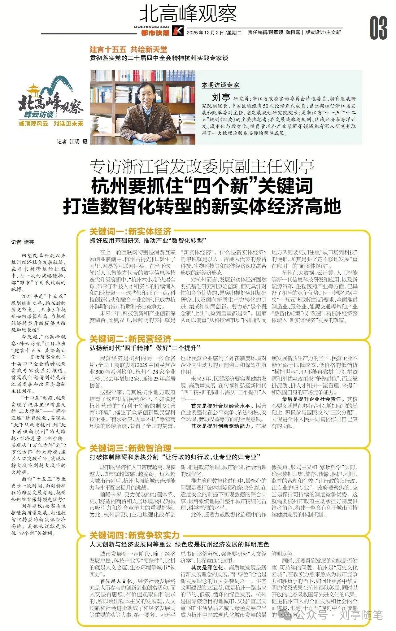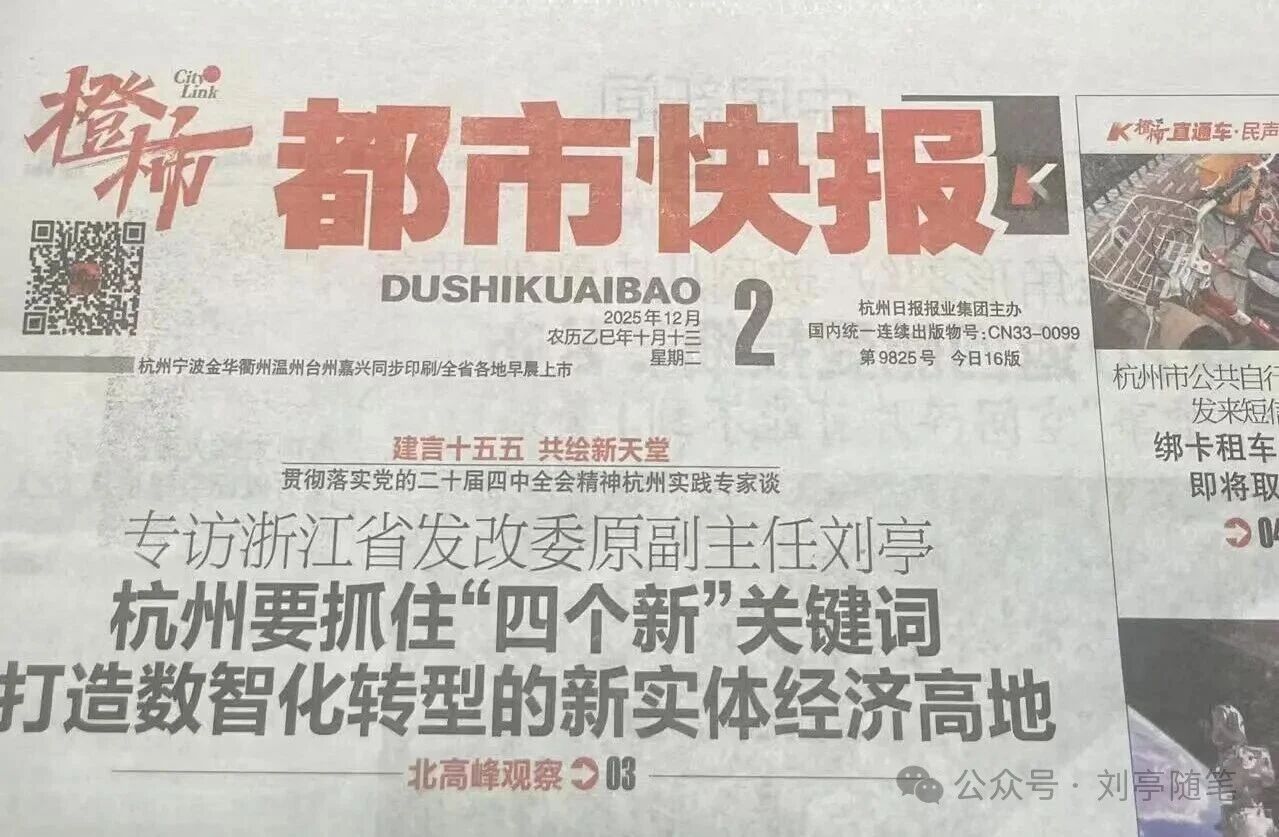 “11月20日,有幸接受了杭州《都市快报》记者诸芸的采访。她说报社要配合“十五五”规划的编制,组织一批专家访谈,为新一轮规划期的杭州发展建言献策。我想到了几个主题词,畅聊了一些个人的想法。记者妙笔生花,很快就形成了一篇条分缕析的访谈稿,并作为 “建言十五五 共绘新天堂”专题的首篇,在“北高峰观察·峰云访谈”栏目中发布了。现将最后送我校核的文稿,以“‘四个新’和杭州‘十五五’发展”为题,在我的公众号上予以转发,以为“十五五”杂谈系列文论“之十三”,做一个记录和汇总;也借此再一次向记者的付出和报社的支持,致以诚挚的谢意……”