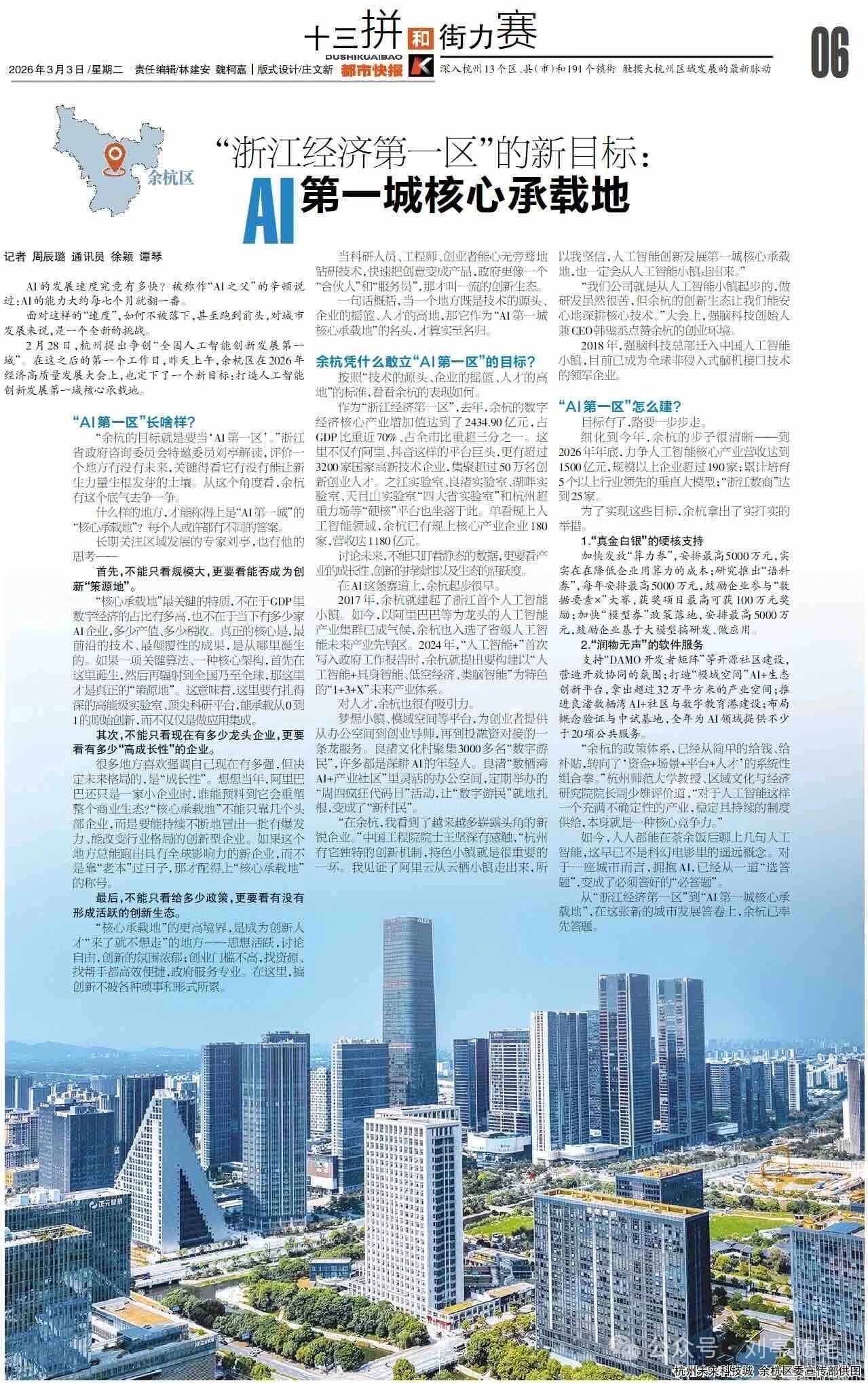 2月28日,杭州市召开了争创全国人工智能创新发展第一城暨建设一流创新生态推进大会,正式吹响建设全国AI第一城的号角。大会后的第一个工作日,今天上午,在2026年余杭区经济高质量发展大会上,余杭发布“打造人工智能创新发展第一城核心承载地行动”。